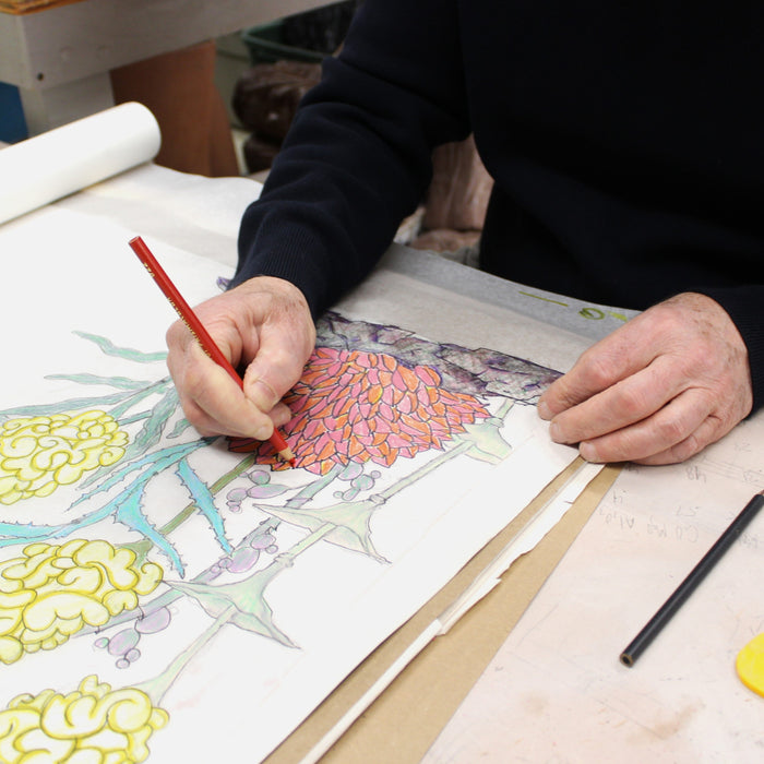 Marc’s embrace of regeneration was at the core of his piece, Tree of Life, which was made up of 56 individual tiles. We paid him a studio visit to learn about the development of the tile work and what is in his kiln now.