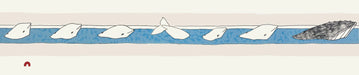 A string of dolphins follow behind a bowhead whale in this lithograph print.