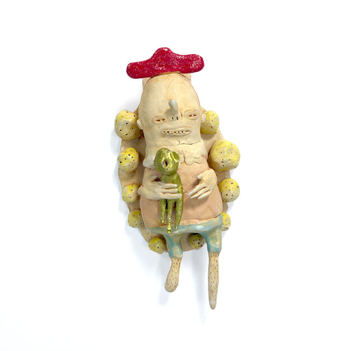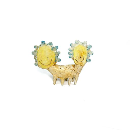 View full detailsA smiling two-headed creature with a sunny yellow face, framed by soft blue petals. Ceramic, glazesApprox. 13 x 2.5 x 9.5 cm Toronto-based artist J...