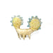 A smiling two-headed creature with a sunny yellow face, framed by soft blue petals.