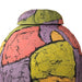 A large handbuilt ceramic jar with lid. Decorated in green, yellow, and pink tones inspired by open rural landscapes.