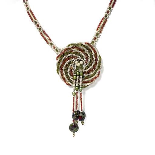 View full detailsThis intricately beaded tri-colour necklace features a spiral pattern and three hanging jasper stone pendants. Jasper stone, white, red, and green ...
