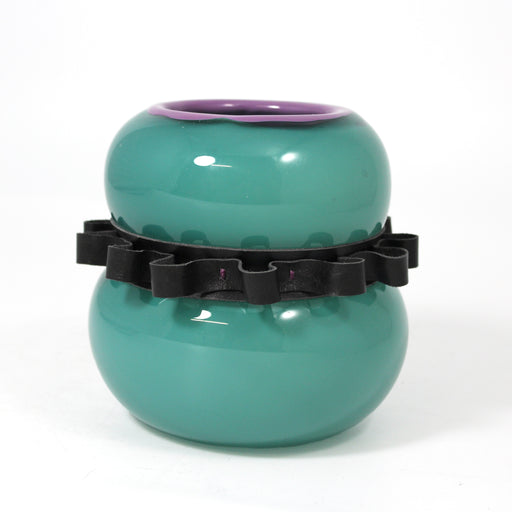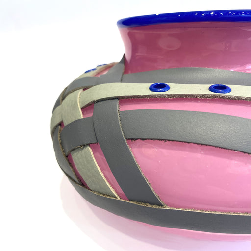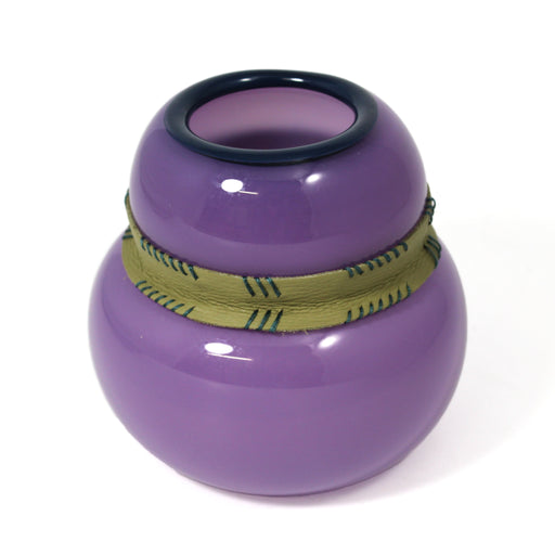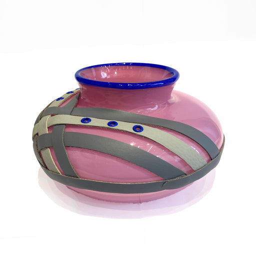 View full detailsLow glass vase with unique leather-worked accents. Blown glass, recycled leather, stitching, rivetingApprox. 19cm x 19cm x 10cm A glass artist and ...
