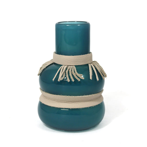 View full detailsMedium glass bottle with unique leather-worked accents. Blown glass, recycled leather, stitching, rivetingDimensions range from: 9cm D x 12cm H to ...