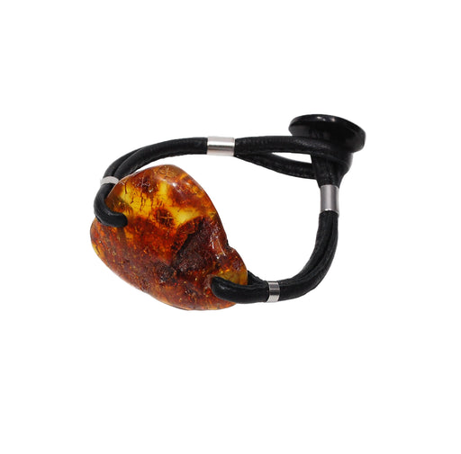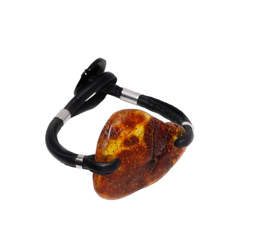 View full detailsOne-of-a-kind bracelet featuring a large natural Baltic amber stone on a stitched black leather cord. Stainless steel accents are non-tarnishing a...