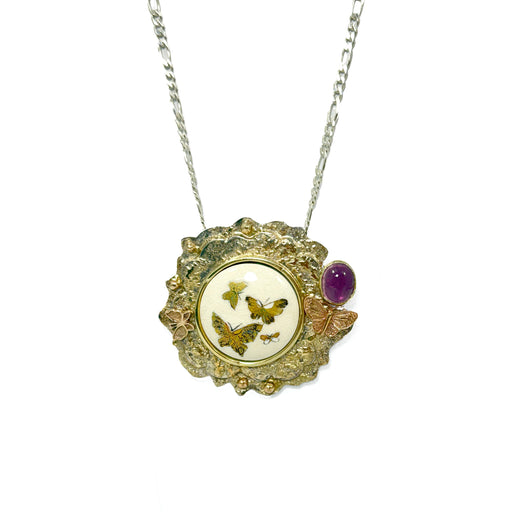 Ornamented with a small Rubellite stone, a hand-painted porcelain Japanese Satsuma button sits at the center of this stunning 10k yellow gold neckl...