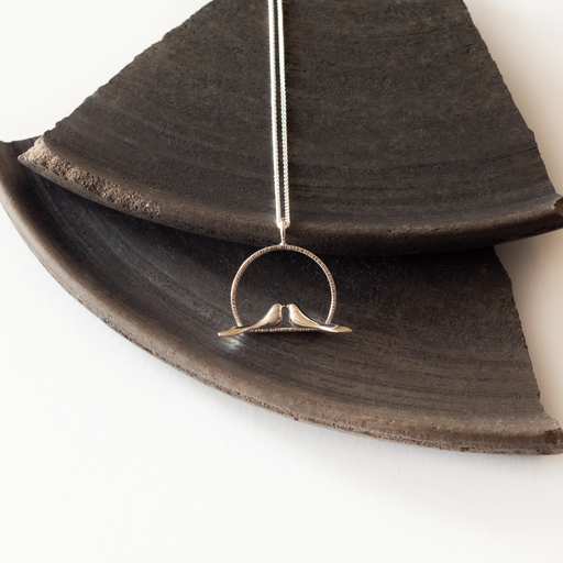 View full detailsThis handcrafted sterling silver necklace features two delicately sculpted birds resting together within a subtly textured circular frame. A quiet ...