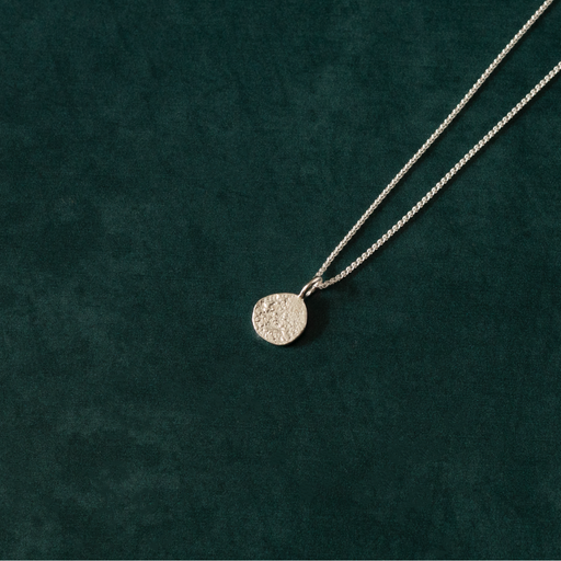 View full detailsThis necklace is hand cut and has a small hammered texture for the finish. It hangs from an elegant chain. 55 x 41 mm, 18" chainSilver pendant and ...