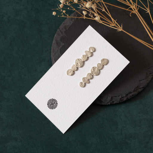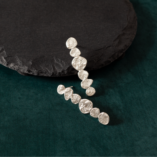 View full detailsThese handcrafted sterling silver stud earrings feature a vertical cluster of softly textured discs, arranged in a gentle, organic rhythm. The repe...
