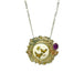 Ornamented with a small Rubellite stone, a hand-painted porcelain Japanese Satsuma button sits at the center of this stunning 10k yellow gold necklace pendant which doubles as a brooch.