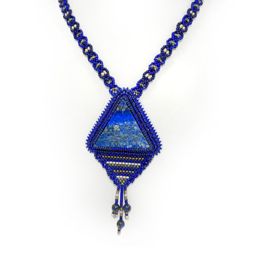 View full detailsIndulge in the elegant beadwork of Sylvaine Solomon with this dark blue beaded necklace, centered around a triangular Lapis stone pendant. Lapis, ...