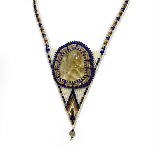 View full detailsLarge stone framed with triangle beaded shape. Large quartz, navy, white, and metallic beadsApprox. 7.5 x 13 cm pendant, 18" beaded necklace Sylvai...