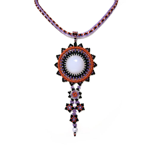 View full detailsFind your calm with this intricately beaded Chalcedony stone pendant necklace. Chalcedony, black, purple, and brown beadsApprox. 5 x 12 cm pendant,...