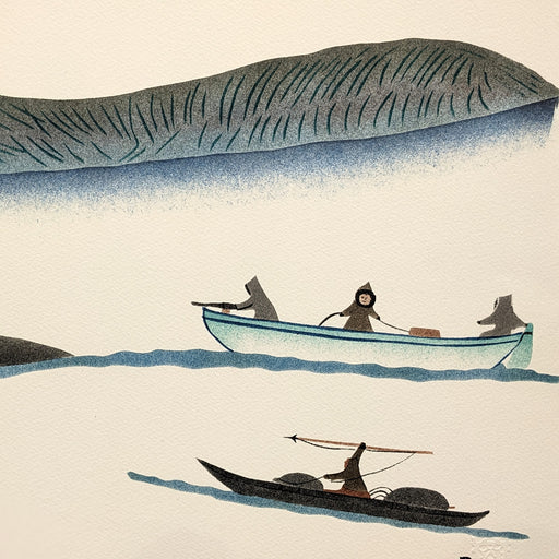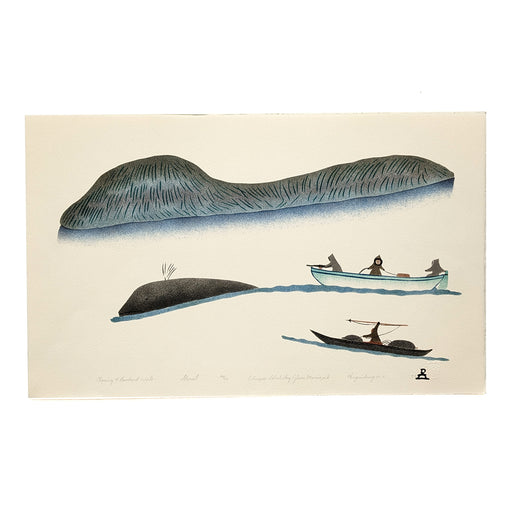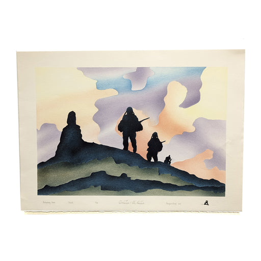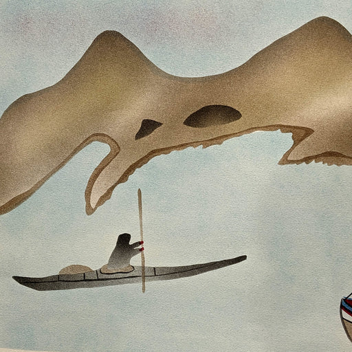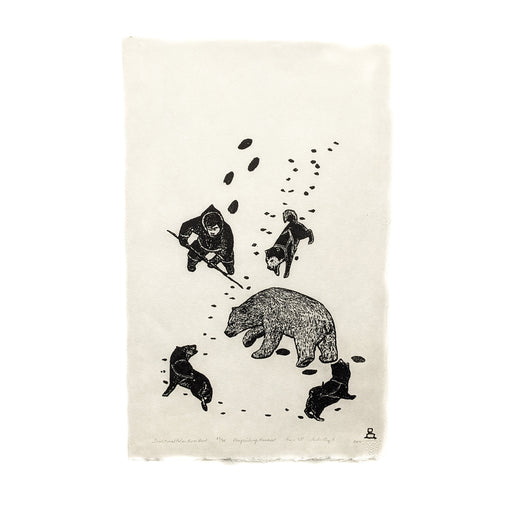 View full detailsA hunter with spear and three dogs confront a polar bear in this print capturing the tension, skill, and survival woven into traditional Inuit life...
