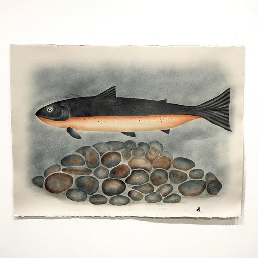 View full detailsA char swims over its eggs in this large print. 2010Edition 18 of 35Stencil22 x 30" Artist - Jamasie Mike Printmaker - Jolly Atagoyuk Jamasie Mike ...
