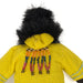 This vibrant yellow Arviat doll features a hand-carved bone face and intricate beadwork, capturing the distinct spirit and artistry of Inuit dollmaking traditions.