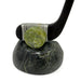 A hockey stick and puck, symbols of the North and community, are the subject of this skillful stone carving.