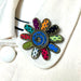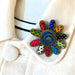 A multi-coloured daisy brooch crafted from a variety of fulled wool sweaters. The center swirl is wrapped in two layers of brass zipper and accented with glass bugle beads. Each petal is meticulously edged in brass zipper and further embellished with glass bugle and seed beads.