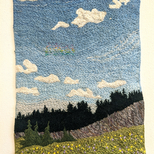 A small hand embroidered wall hanging depicting Sedna riding a Qamutiik (sled). Felt, threadApprox. 9 x 10" Registration no. 182235 Veronica grew u...