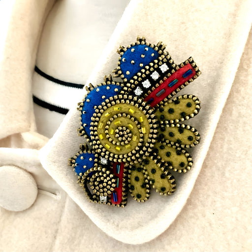 An abstract fan brooch crafted from wool felt, featuring a brass zipper swirl and embellished with glass bugle beads and repurposed rhinestones. Li...