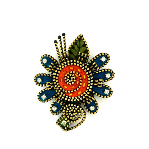An abstract turquoise flower with leaf brooch, crafted from wool felt and wrapped with brass zipper. Embellished with repurposed rhinestones and gl...