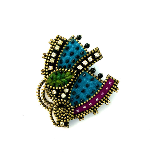 An abstract fan brooch featuring a turquoise swirl, crafted from wool felt and wrapped with brass zipper. Embellished with repurposed rhinestones a...