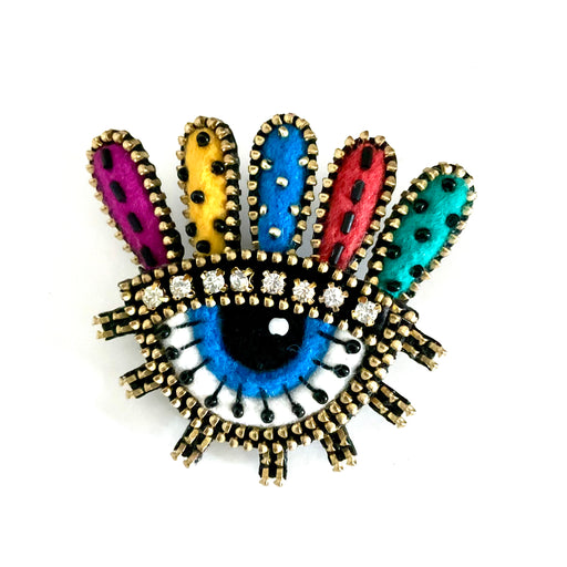 A lovely heart with eye wool felt brooch enveloped with sections of high quality brass zipper. This brooch has a blue eye at the centre of the hear...