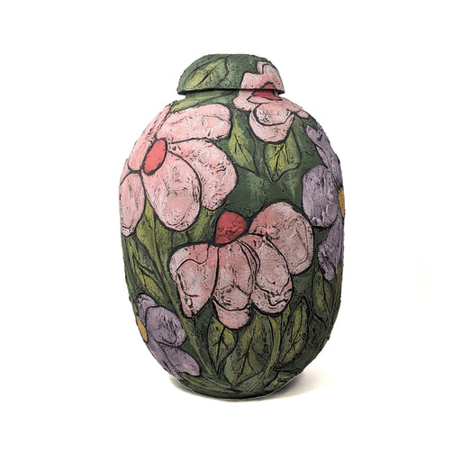 A large handbuilt lidded jar, adorned with bright floral motifs. Slip decoration and carved details bring each flower to life. CeramicApprox. 53 x ...