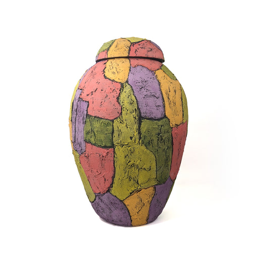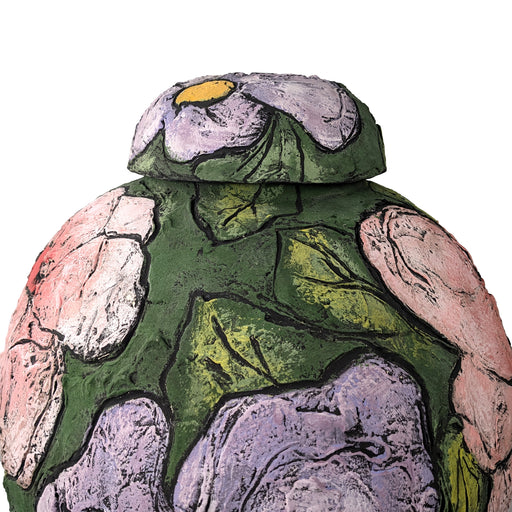 View full detailsA large handbuilt ceramic jar with lid. Decorated in green, yellow, and pink tones inspired by open rural landscapes. CeramicApprox. 58 x 38 cm Mar...