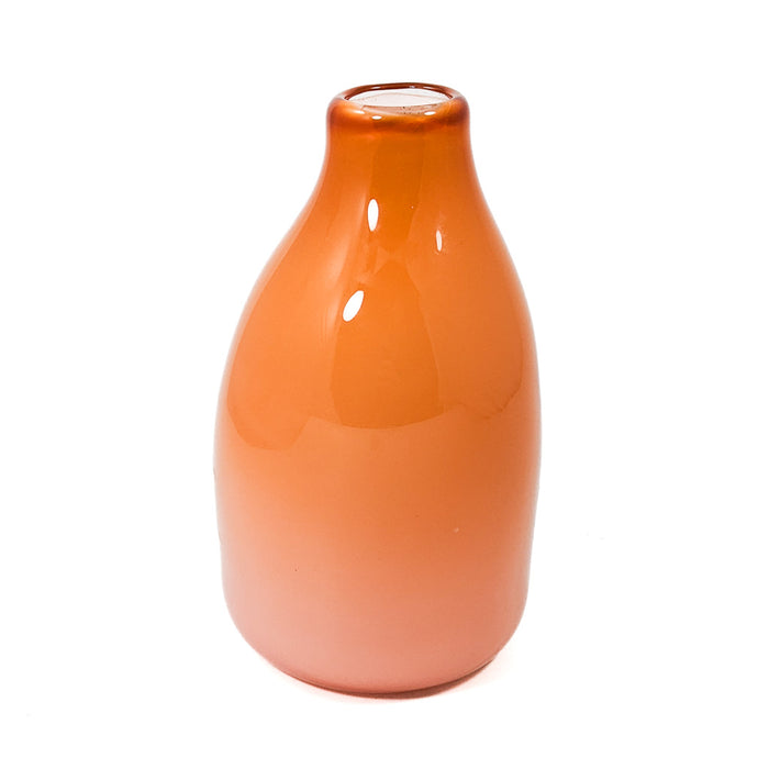 A vibrant glass bud vase featuring a gradient from orange to pink.