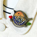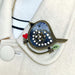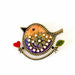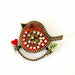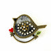 A Bird on a Branch brooch, in Noro Kureyon wool and carefully hand-felted. The bird is wrapped with high-quality brass zipper sourced from Montreal and embellished with a brass finding and repurposed rhinestones. Lightweight yet firm, this brooch is a charming, durable accent for your lapel or bag.