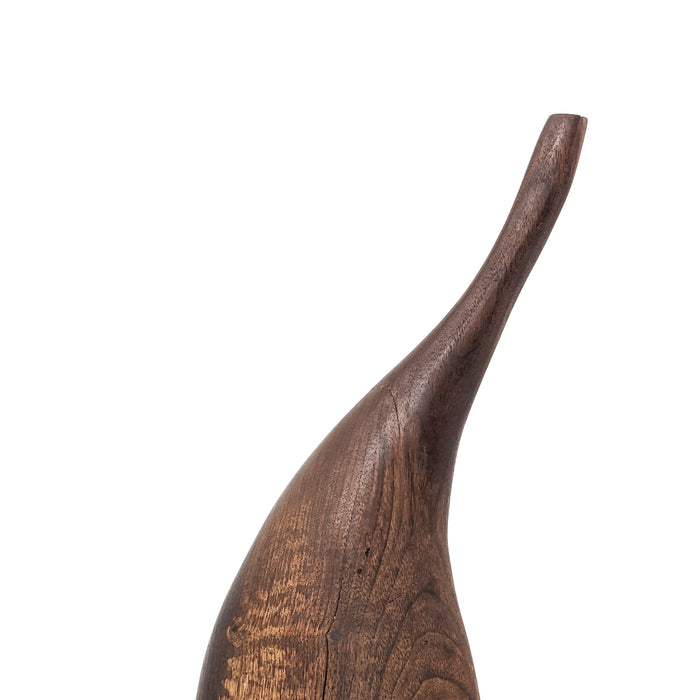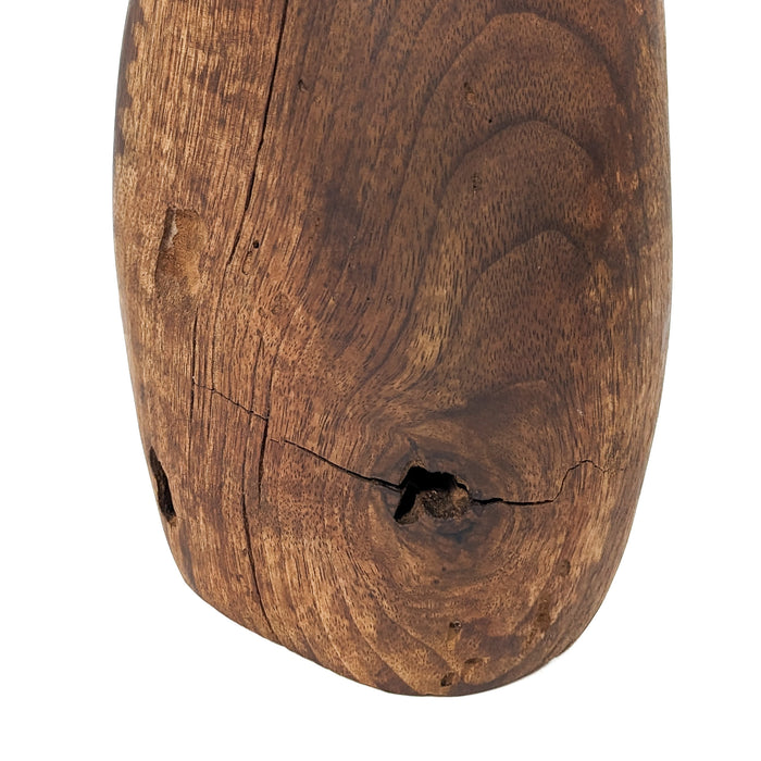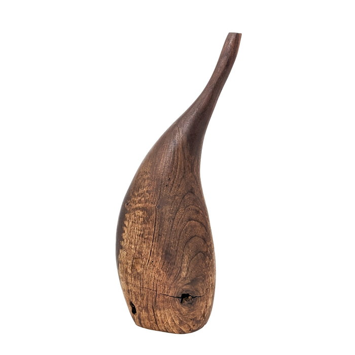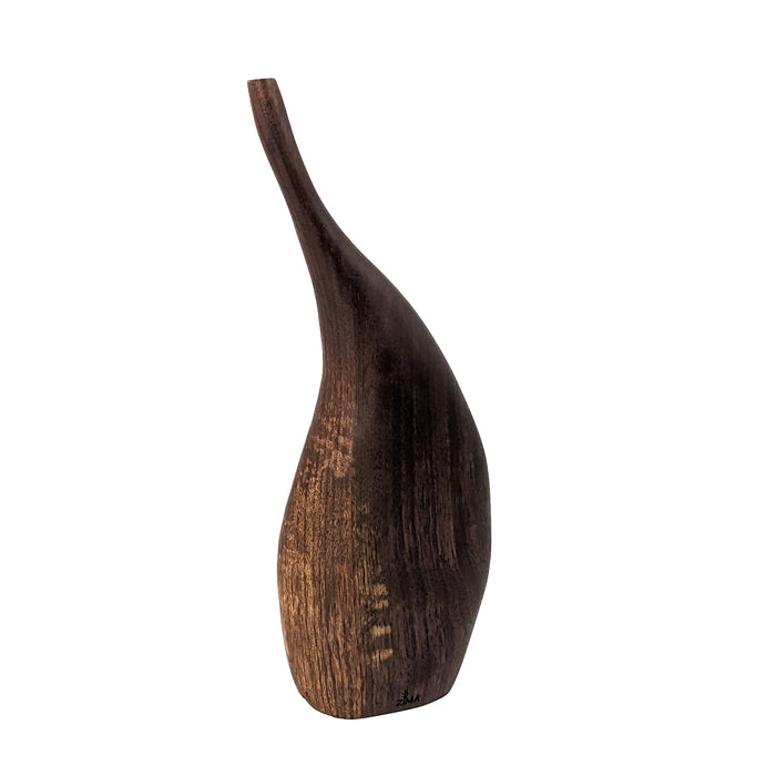 A tall dry bud vase made from beautiful walnut with the natural grain and knots of the wood visible.