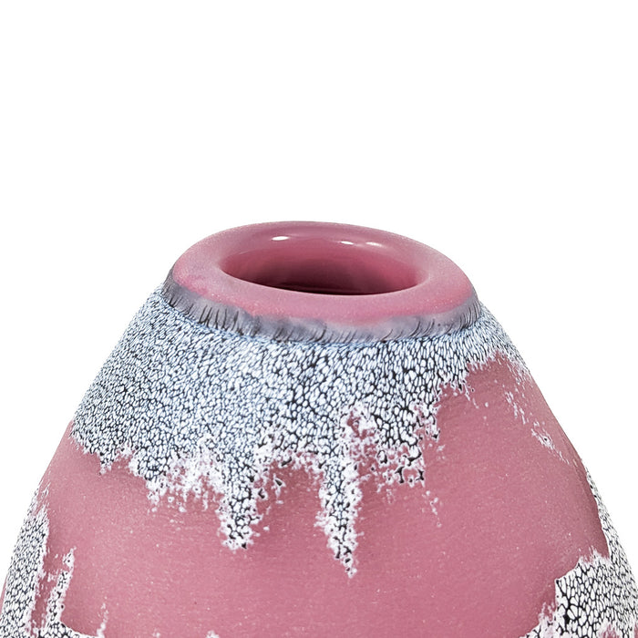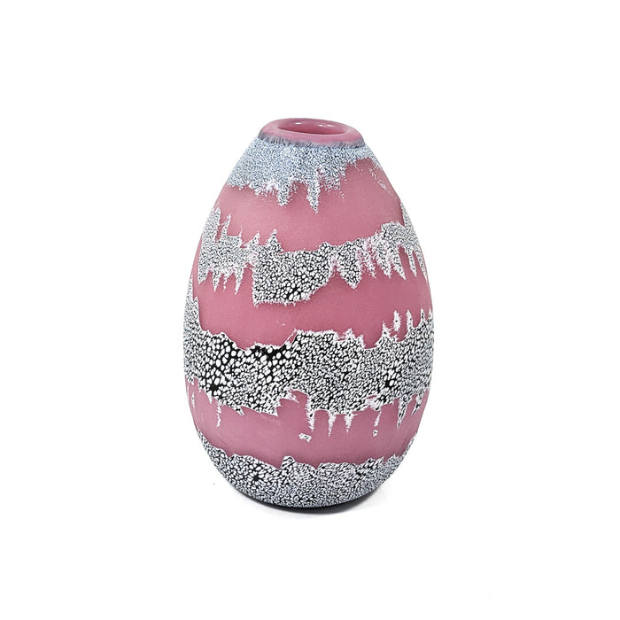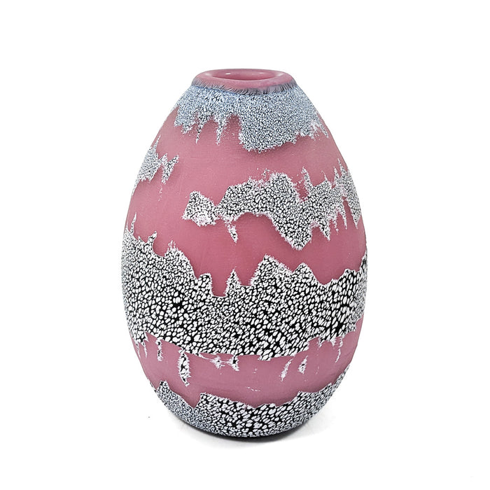 The Woven Vessel series is inspired by traditional Panamanian textiles. They come in a variety of shapes and sizes. White glass frit dots the surface of the opaque, black forms. This piece has had the outer layer carved into, to reveal the pink glass below. These are sure to suit any style of décor!